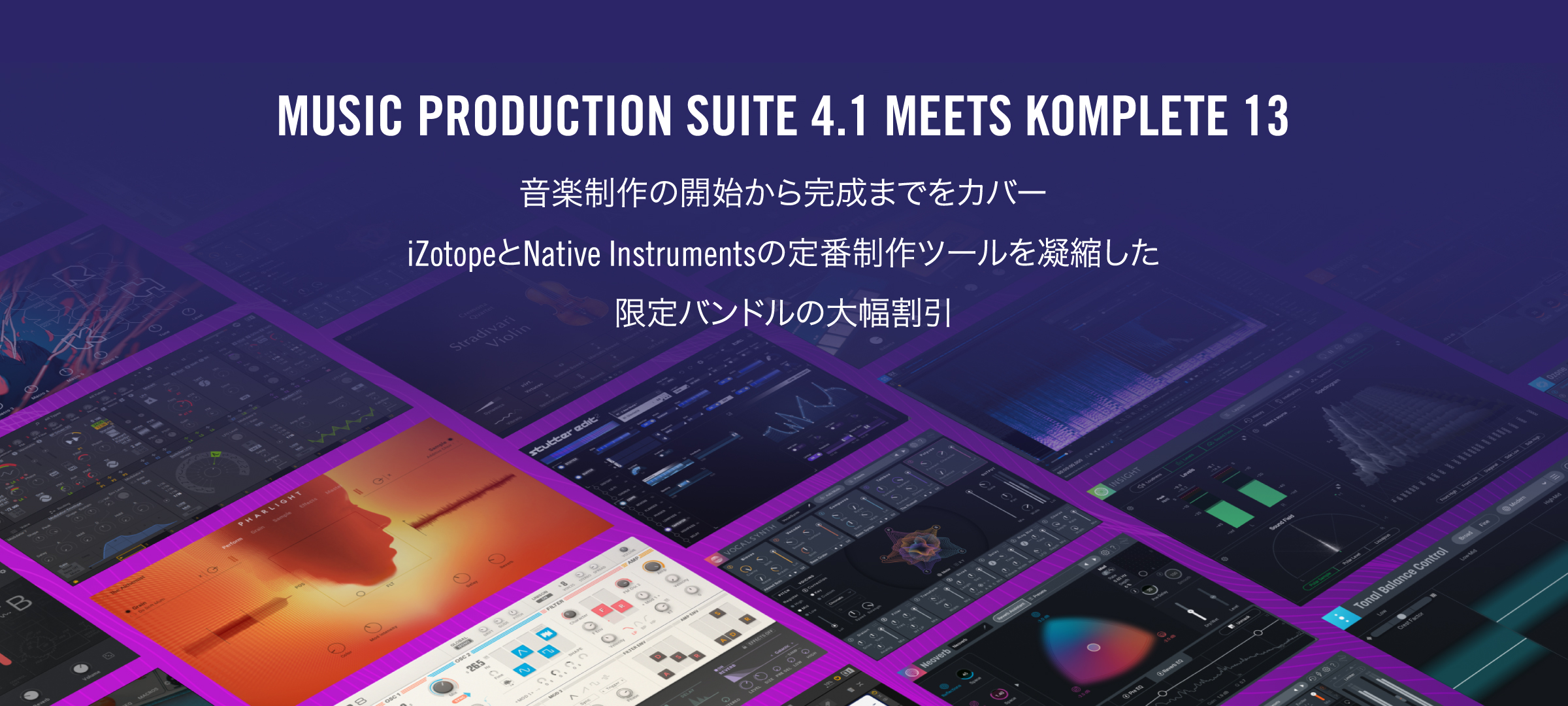 65種類のインスツルメントと35,000以上のサウンドをパッケージした、業界最高クラスの音楽制作パッケージKOMPLETE 13と、RX 9 Standard、Ozone 9 Advancedなど最高の音楽制作プラグインをバンドルしたMusic Production Suite 4.1を、同時にお得な価格で手にいれるチャンスです。また、KOMPLETE 13 SELECTをお持ちの方や、KOMPLETE 13以前のバージョンをお持ちの方が更にお得に入手出来るアップグレード版もご用意。作曲、アレンジ、ミキシング、マスタリングに必要なツールがすべてが揃ったこのバンドルを、是非この機会に入手してください!